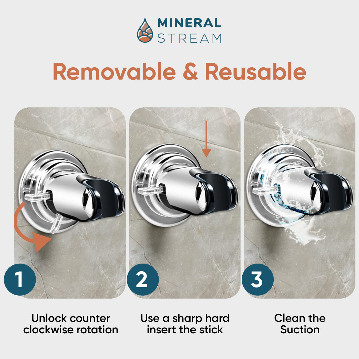 To install your MineralStream Suction Holder on any flat and smooth surface (e.g., glass, marble, polished tile, or metal):